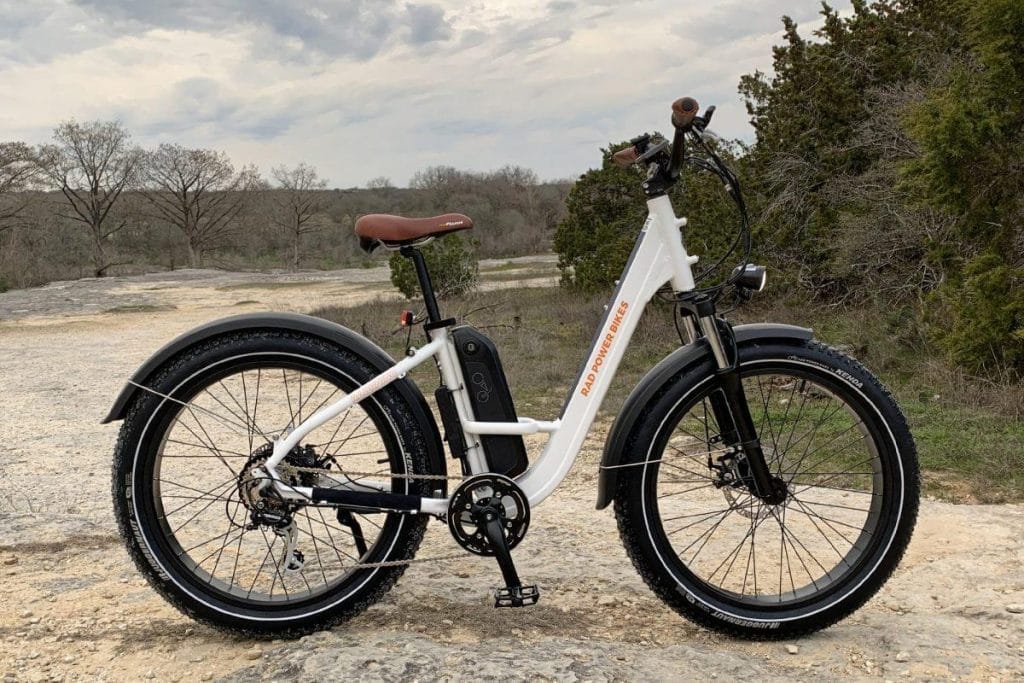 the Rad Power Bikes RadRhino Step-Thru 1 250W! This European wonder borrows its DNA from the popular RADRover Step-Thru in the US and Canada but is tailored just for the European crowd. Sporting a robust yet sleek design, this e-bike comes in two stylish colors: a matte white and an all-black version, catering to various aesthetic preferences.